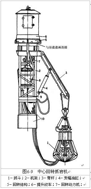 中心回轉(zhuǎn)抓巖機(jī)是一種大斗容抓巖機(jī),它直接固定在鑿井吊盤上,以壓風(fēng)作為動(dòng)力,該設(shè)備具有使用范圍廣、適應(yīng)性強(qiáng)、設(shè)備利用率高、動(dòng)力單一、結(jié)構(gòu)緊湊、占用井筒面積不大,便于井筒布置、安全可靠、操作靈活、維護(hù)方便等優(yōu)點(diǎn),目前在煤炭礦山得到了普遍的使用。該機(jī)由抓斗、提升機(jī)構(gòu)、回轉(zhuǎn)機(jī)構(gòu)、變幅機(jī)構(gòu)、支撐系統(tǒng)和機(jī)架等部件組成,見圖6-9。
