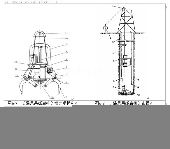 中心回轉抓巖機是一種大斗容抓巖機,它直接固定在鑿井吊盤上,以壓風作為動力,該設備具有使用范圍廣、適應性強、設備利用率高、動力單一、結構緊湊、占用井筒面積不大,便于井筒布置、安全可靠、操作靈活、維護方便等優點,目前在煤炭礦山得到了普遍的使用。該機由抓斗、提升機構、回轉機構、變幅機構、支撐系統和機架等部件組成,見圖6-9。