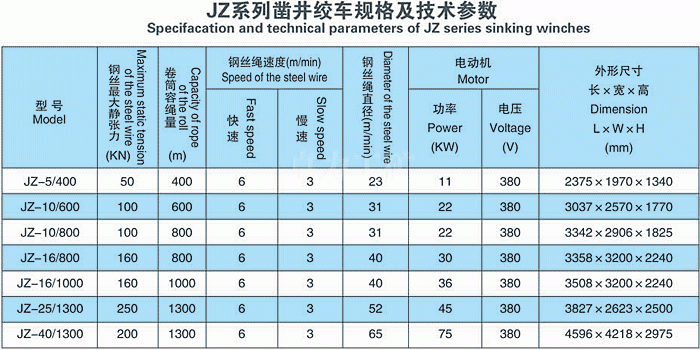 JZ系列鑿井絞車具有提吊能力強、容繩量大、運轉平穩等優點。 用途 主要用于金屬礦、非金屬礦豎井的井筒掘進工程懸吊吊盤、水泵、風筒、壓縮空氣筒、注漿管等掘進設備和張緊穩繩,也可作其它井下和地面起調重物使用。