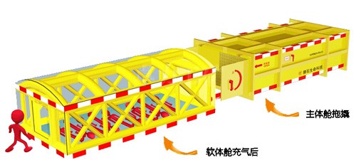 現國內礦山安全避險無很好的措施。為在很好保護災變發生后人員安全,設計一種鋼結構救生艙,艙內配置飲用水和食物。用于礦難發生后的緊急避難,放置于礦山井下作業面附近。在遇險人員無法撤離危險區域時可以迅速躲進救生艙,救生艙無需外部能源補給,就可以為幸存人員躲避有毒有害氣體、濃煙煙塵及氧氣缺乏等危害,提供一段時間的生命生存保障。對于挽救井下幸存人員的生命具有積極而重大的意義。